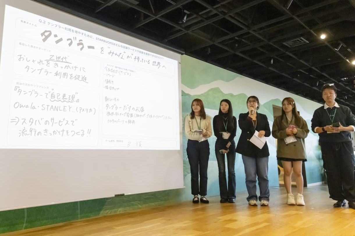 藤井さんのグループでは「タンブラー利用を増やすための店舗サービスや体験」をテーマに、Z世代に向けておしゃれをきっかけに利用を広めるアイデアを提案しました。具体的には、季節限定デザインやファッション性を取り入れたタンブラーで利用を広げる提案をしました。「かっこいい文化をつくりたい」という想いがスターバックスの理念と重なり共感を呼びました。